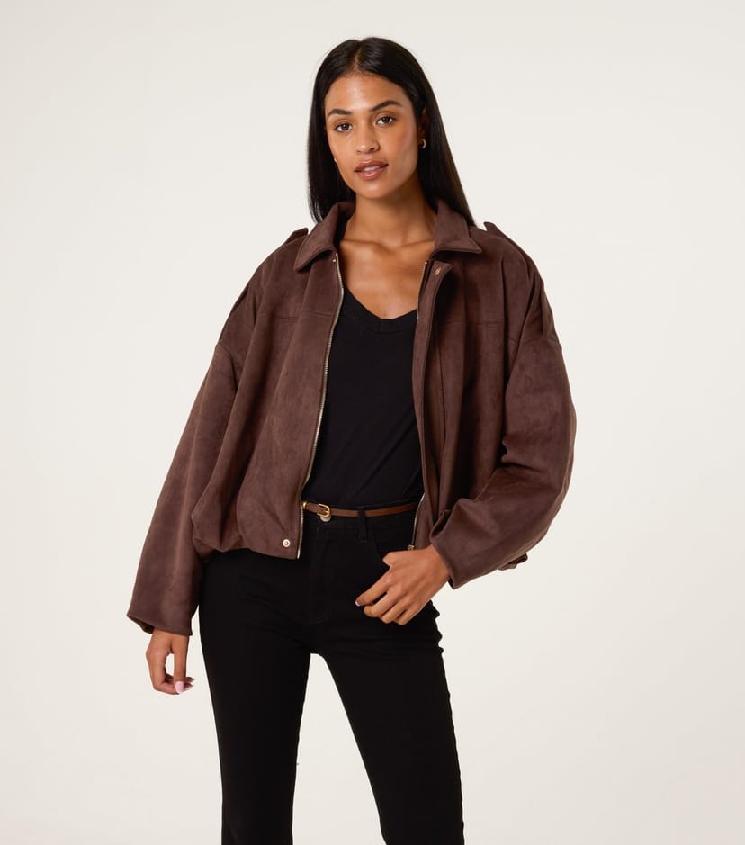 The Blue Vanilla Dark Brown Faux Suede Jacket is made from faux suede.