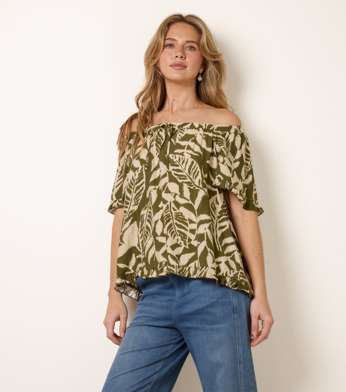 Casual off-shoulder top in khaki leaf print with a relaxed fit. Perfect for everyday wear with its effortless style. Made from woven fabric for comfort.