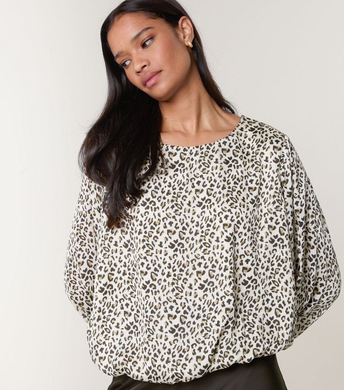 Trendy Blue Vanilla top in khaki leopard print with a crew neckline. Features a relaxed fit and long sleeves with elasticated cuffs. Perfect for casual and smart-casual looks.
