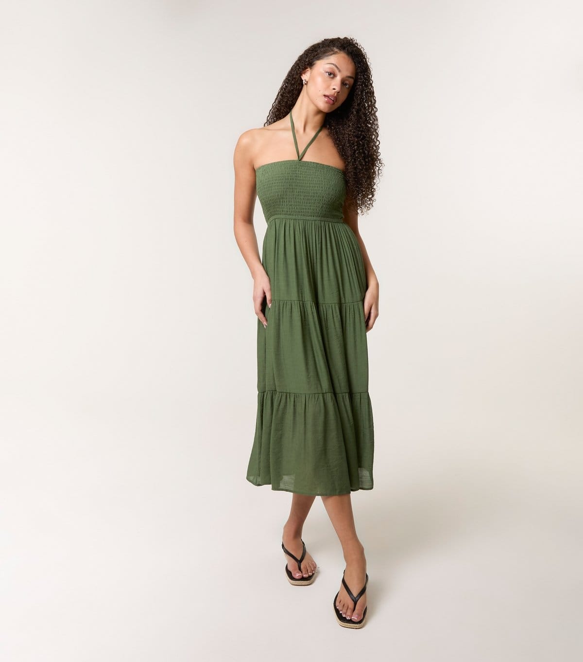 See all outfit ideasThis khaki midi dress features a smocked bodice and a floaty tiered skirt. Ideal for summer, it includes halterneck ties.