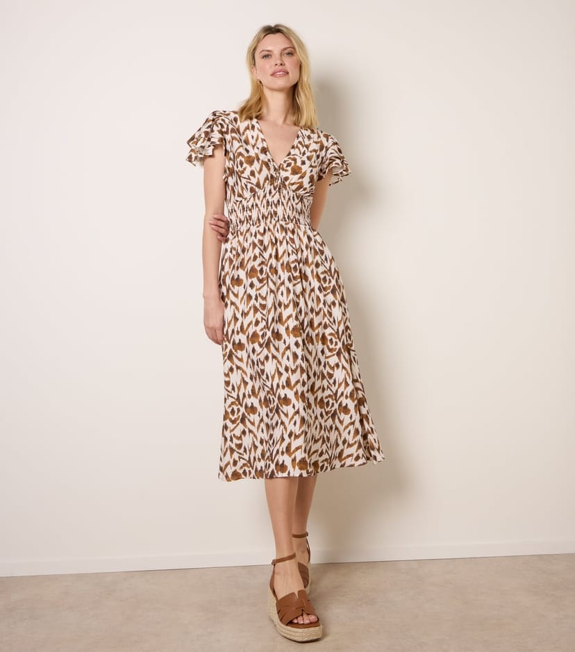 This light brown midi dress from Blue Vanilla features an elegant A-line skirt and flutter sleeves for a breezy look. Its eye-catching abstract print brings a dash of fun to any look. Perfect for casual summer days.
