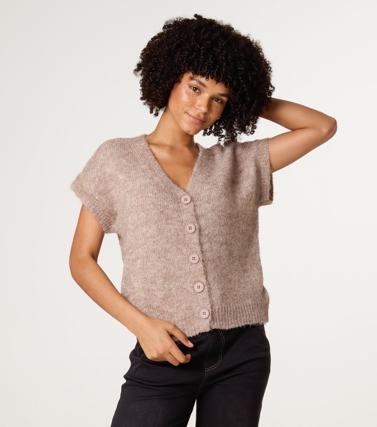 Stylish light brown knitted cardigan from Blue Vanilla. Features short cap sleeves and a central button closure. Ideal for layering and casual wear.