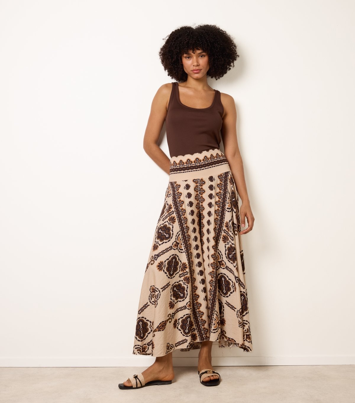 Flowing crop trousers in brown paisley print from Blue Vanilla. Features a high waist, elasticated back, and a relaxed fit. Ideal for casual outings.