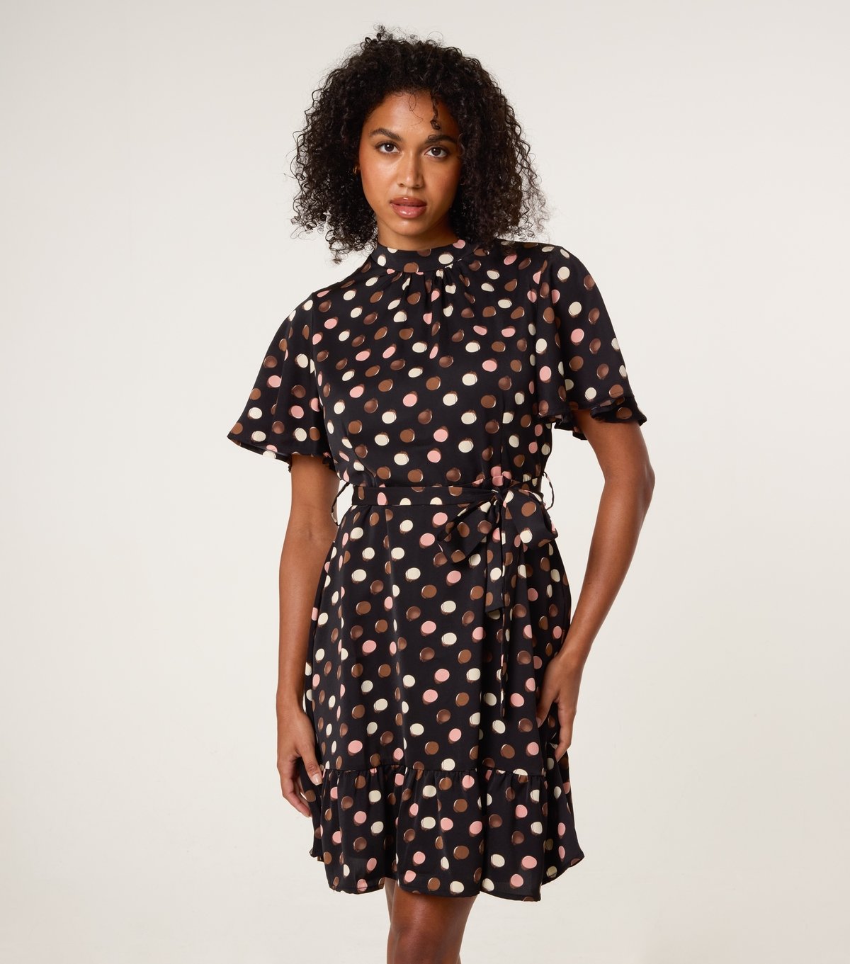 Playful black polka dot mini dress by Blue Vanilla. Features a tie waist and ruffled hem for a feminine touch. Ideal for any occasion.