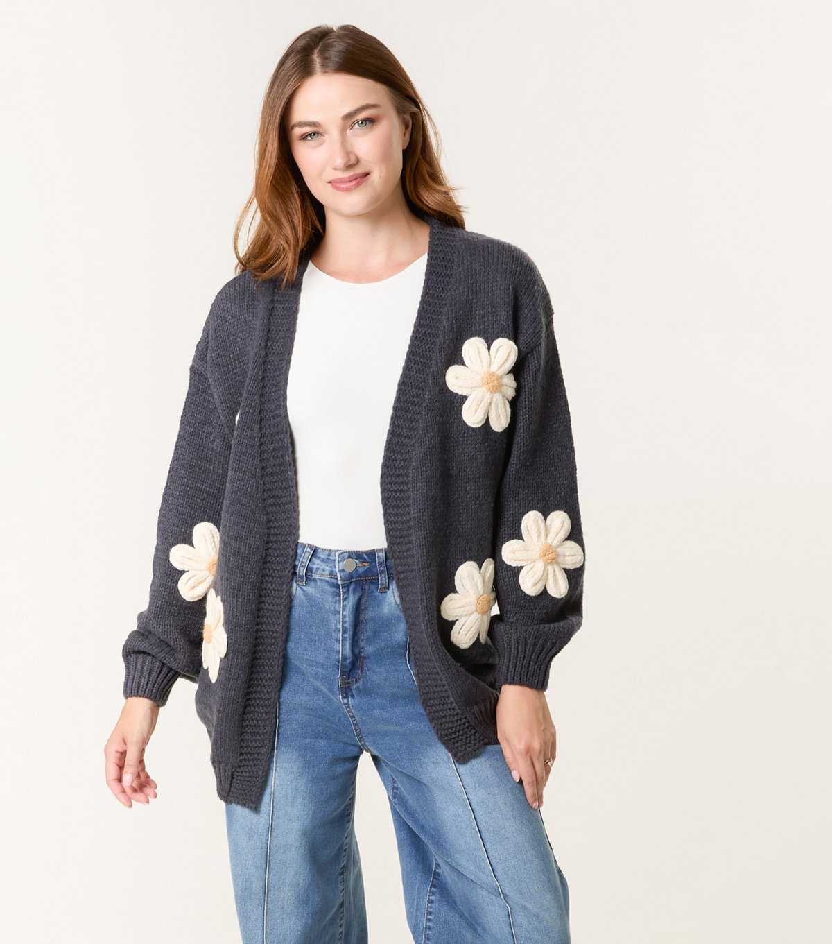 Stylish navy cardigan from Blue Vanilla featuring playful floral appliques. The relaxed fit and dropped-shoulder shape add a casual yet chic touch. Ideal for layering in colder weather.