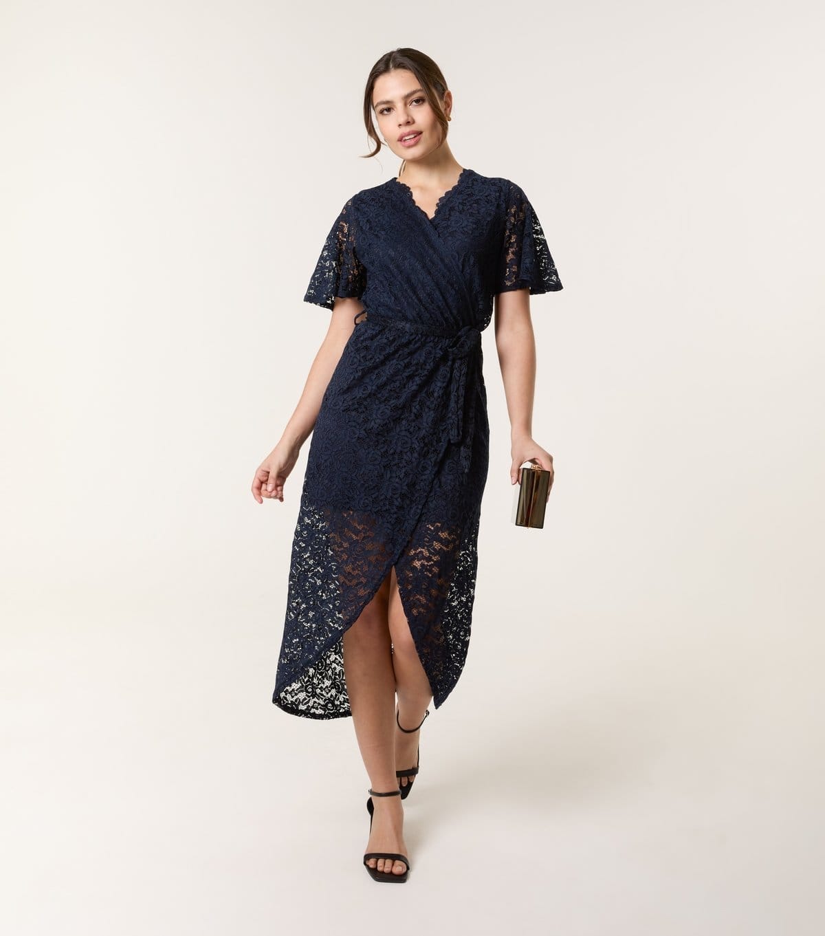 The Blue Vanilla Navy Lace Wrap Midi Dress is available in sizes 16.