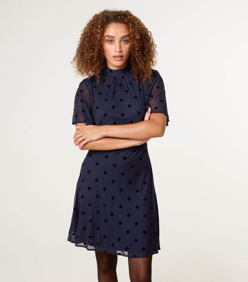 Playful and preppy, this navy dress from Blue Vanilla features black polka dots. Its high neck and short fluttery sleeves add an elegant touch, ensuring you stay stylish and comfortable all day.