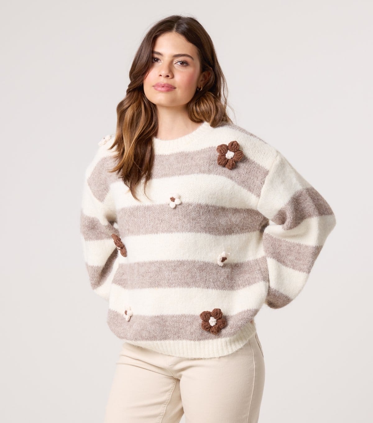 This relaxed-fit jumper by Blue Vanilla features a striped pattern alternating between off white and mink. Adorned with chunky floral appliques, it adds a playful touch to your knitwear collection. Ideal for casual wear.