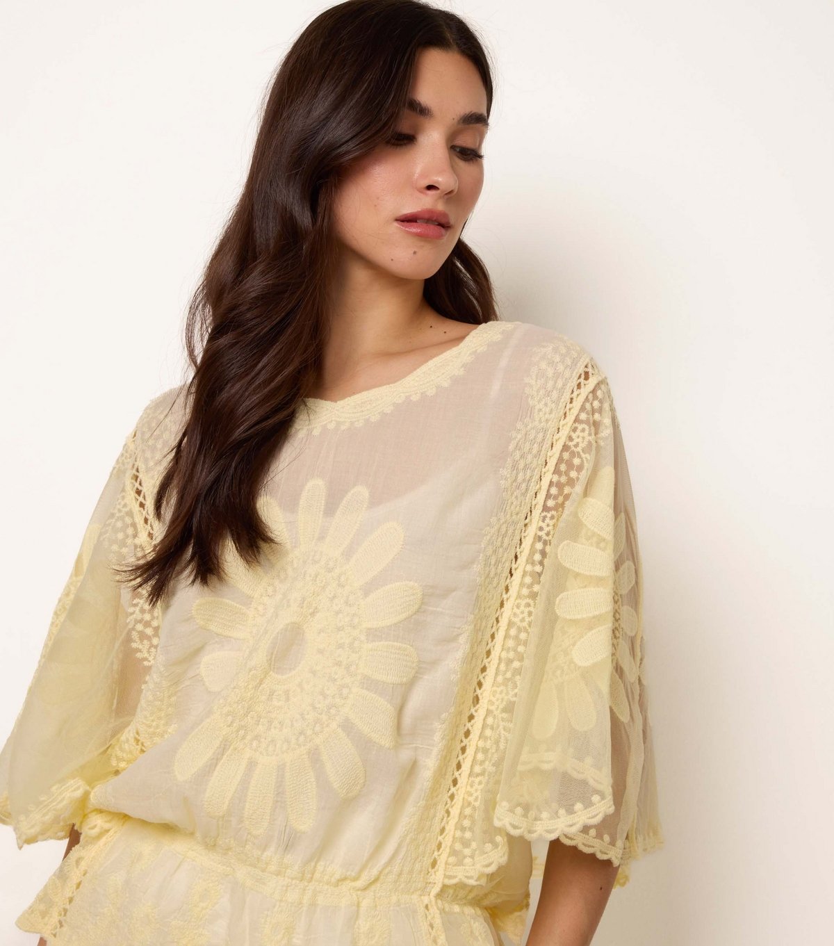 Charming pale yellow blouse with a sunflower pattern and lace trims. The floaty structure and peplum hem add a touch of elegance. Ideal for casual outings.