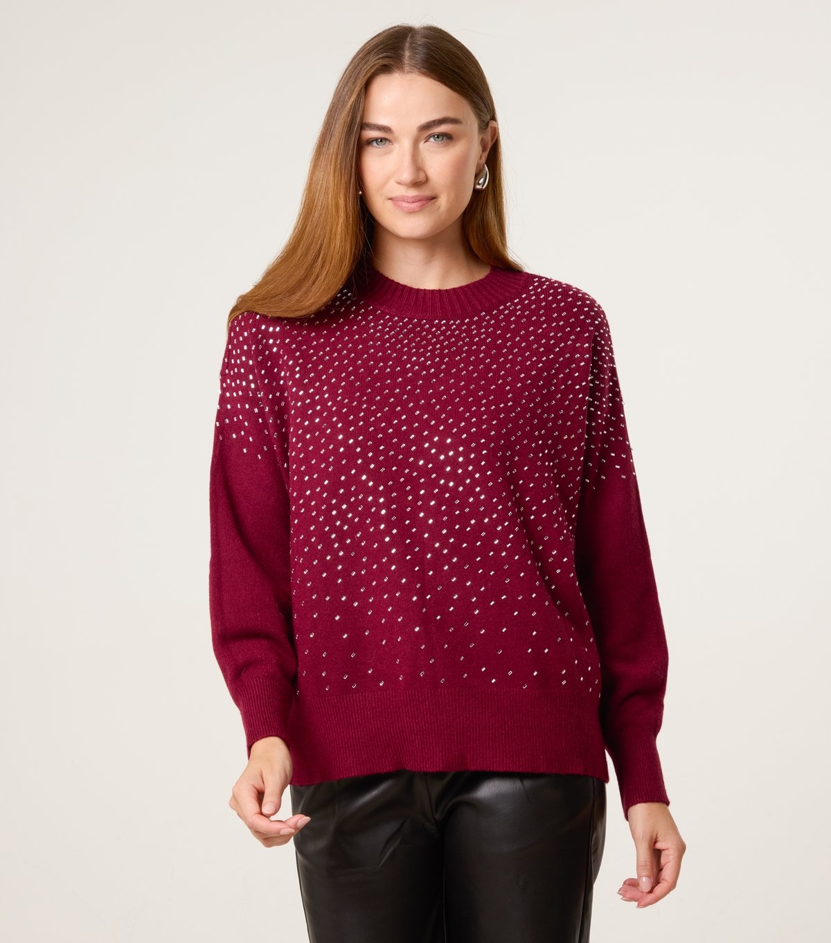 This cosy light burgundy jumper from Blue Vanilla adds a touch of sparkle to your winter wardrobe. The relaxed-fit knit features glimmering diamanté embellishments for a festive look.