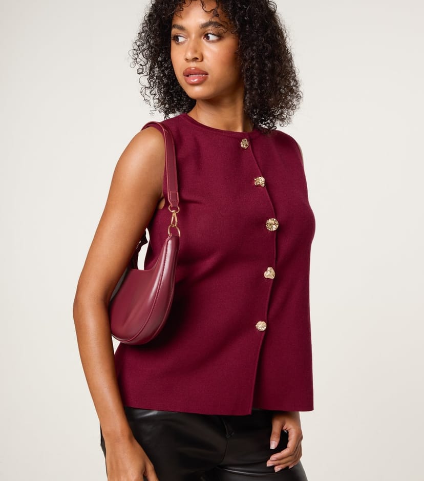 This plum knitted vest from Blue Vanilla features a sleeveless silhouette and is perfect for smart-casual looks. It is finished with gold-tone embellished button hardware.