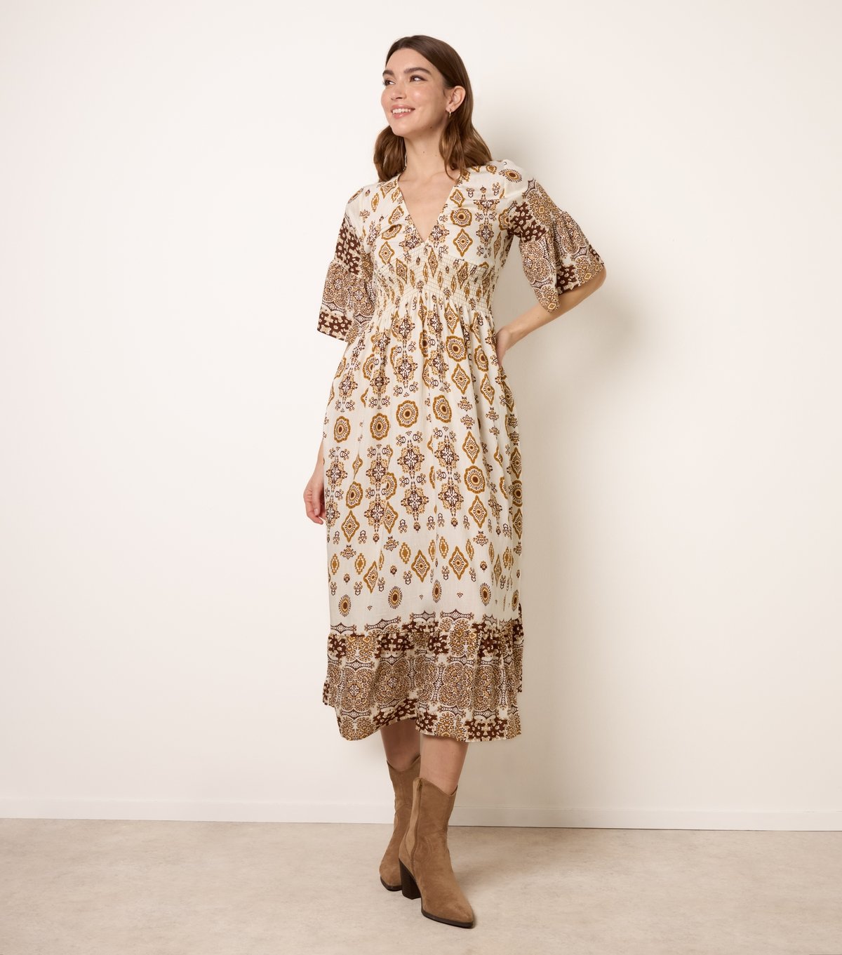 Charming midi dress in rust with a paisley pattern and detailed border print. Its flowing skirt and bell sleeves add a bohemian flair, perfect for sunny days.