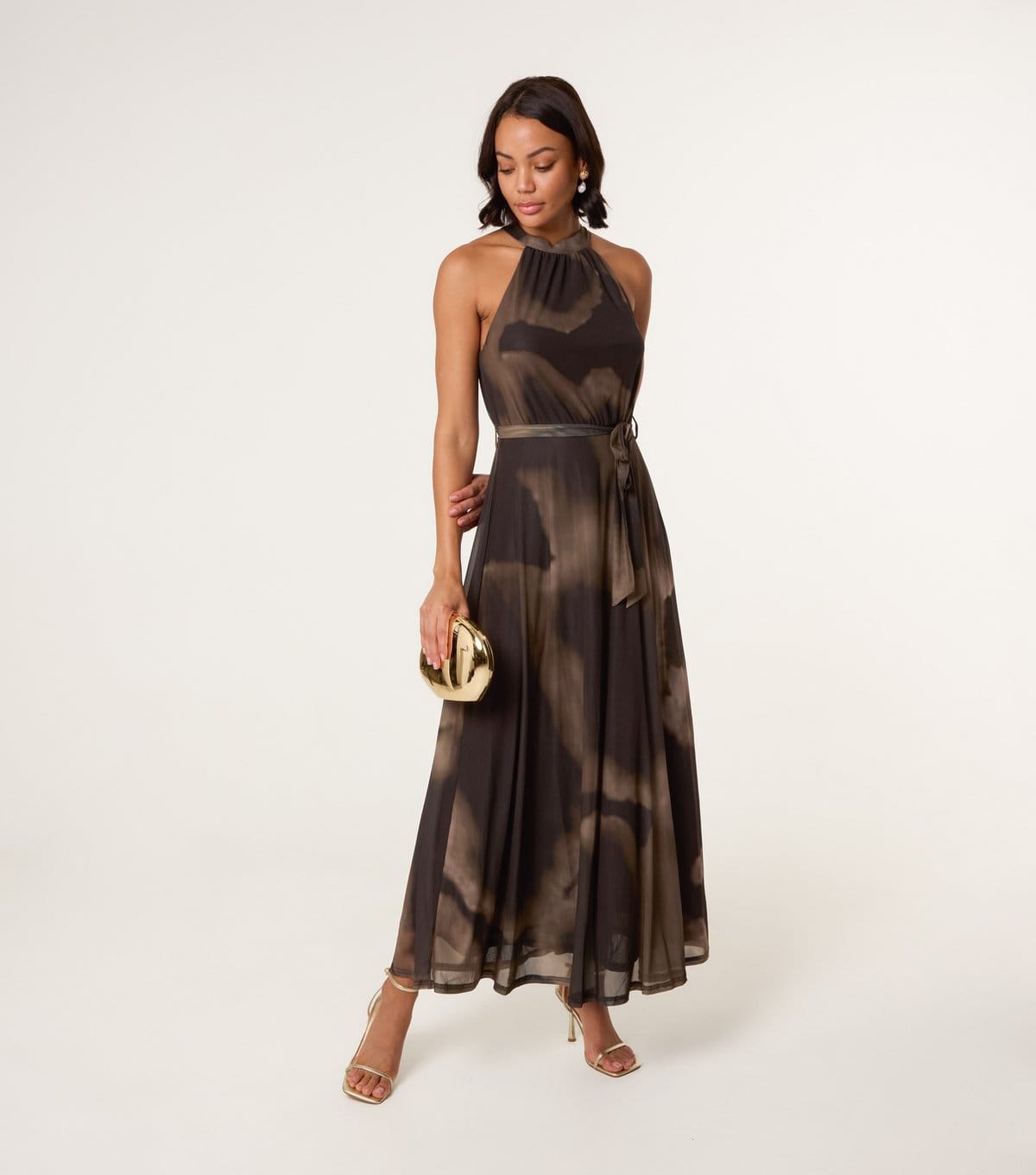 “Pair with gold high-heeled sandals and a metallic clutch bag for a glamorous evening look.”