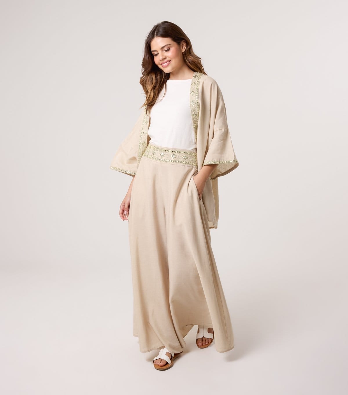 Versatile Blue Vanilla wide leg trousers in a neutral stone shade. Featuring a flowing silhouette and sparkly embellishments on the waist. Perfect for smart casual days.