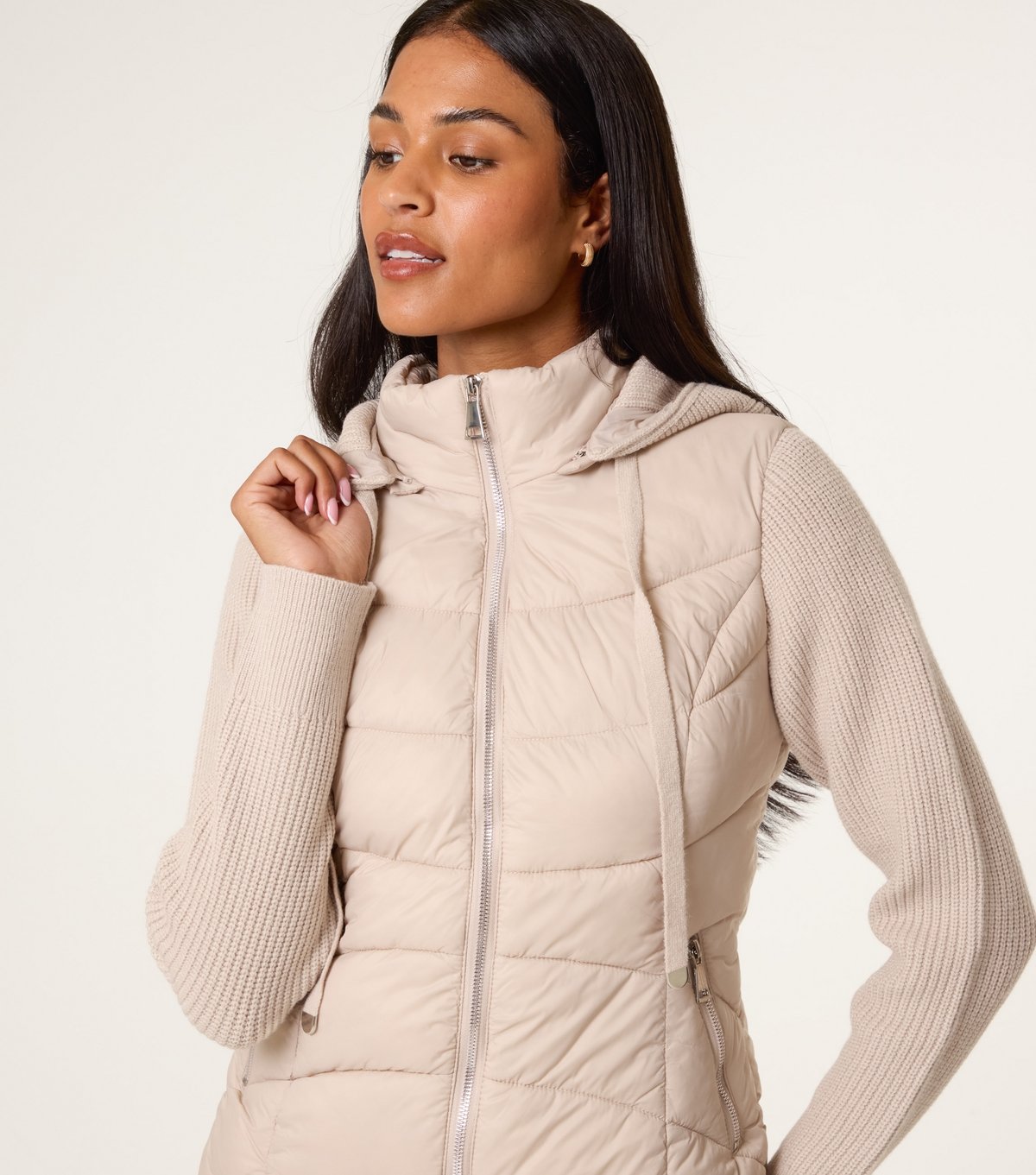 This stone puffer jacket from Blue Vanilla features a knitted texture and a detachable hood. The long sleeves add warmth and style, perfect for cooler days.