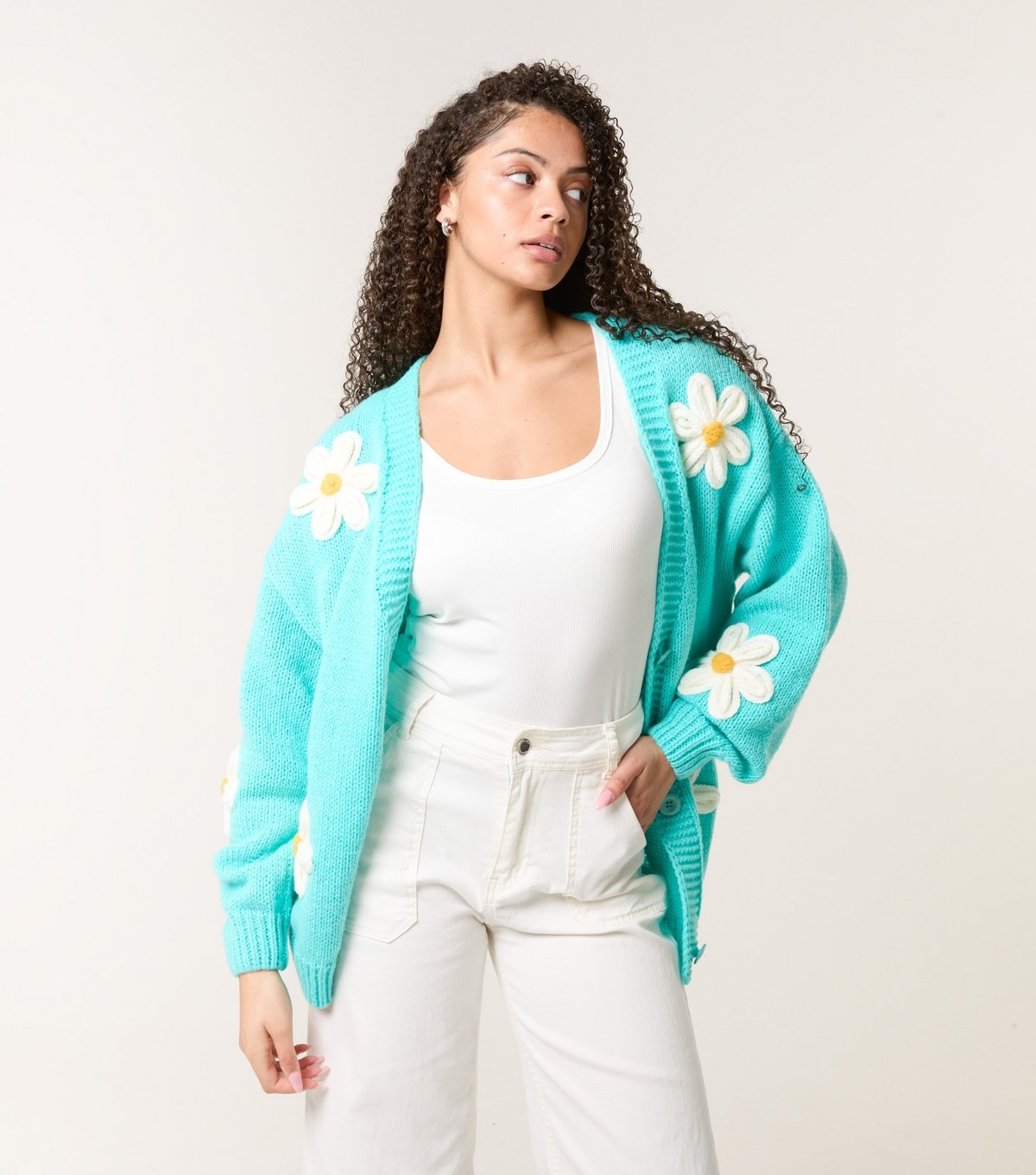 The Blue Vanilla Turquoise Daisy Appliqué Cardigan is ideal for casual, everyday, lounging.