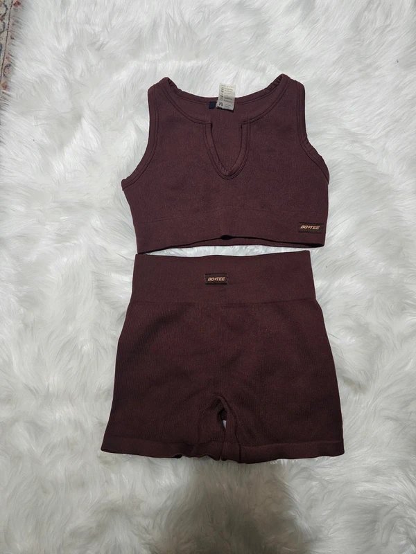 The Bo+Tee Burgundy and Black Gym Set is available in sizes M.