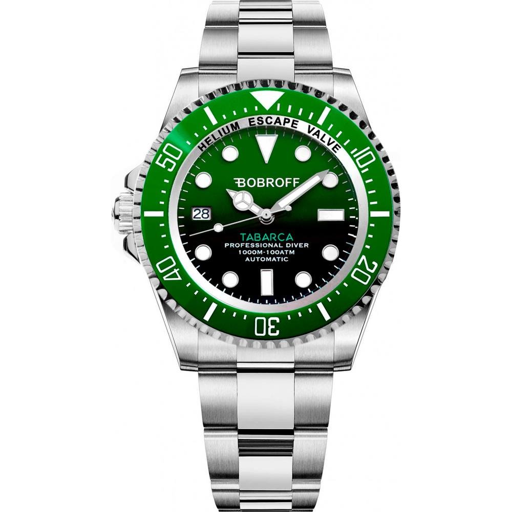 Stylish silver automatic watch from Bobroff. Features a green dial with a black sub-dial and white hands. Ideal for casual and formal occasions.
