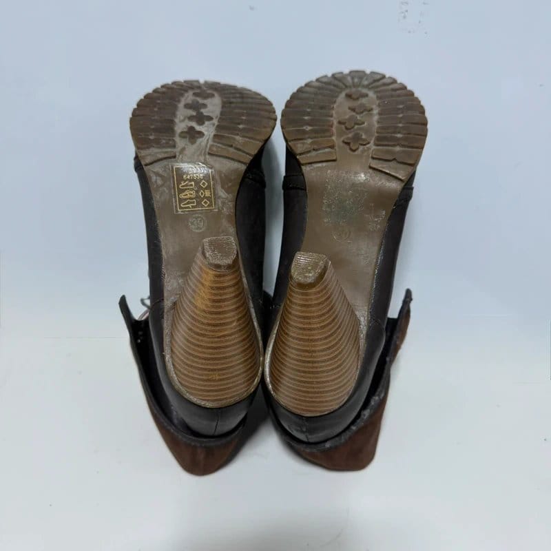 Elegant Bodyflirt ankle boots in rich chocolate brown leather. Featuring a unique fold-over cuff and stacked heel, these boots add a stylish touch to autumn and winter outfits.