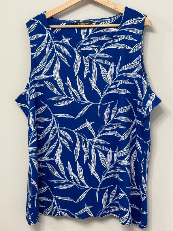 The Bonmarché Plus Size Blue Leaf Print Sleeveless Top is available in sizes XXL.