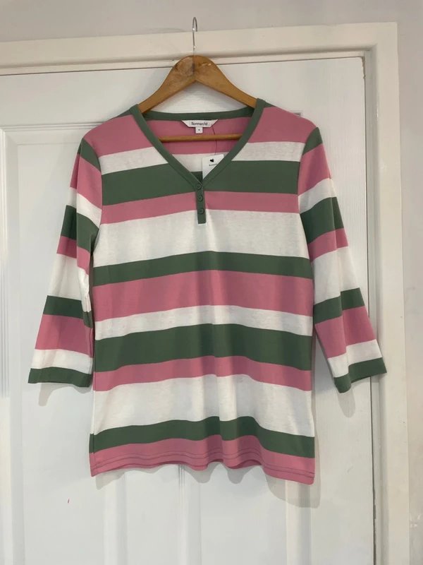 This pink and green striped long-sleeve top from Bonmarché features a V-neckline and button closure. Crafted from a soft cotton blend, it offers a casual yet stylish look. Perfect for layering over jeans or skirts, this top is ideal for everyday wear.