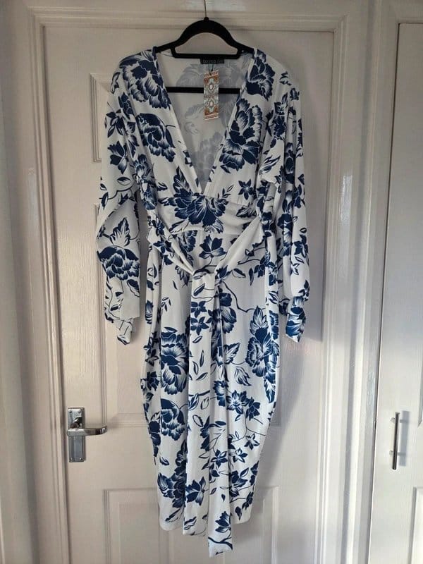 The Boohoo Blue and White Floral Midi Dress is available in sizes L.