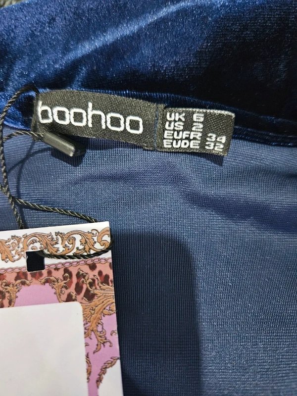 The stunning Boohoo navy velvet wrap dress features a wrap style that is very flattering and a short sleeve design. The dress boasts a midi length and a lightweight comfortable fit, perfect for dressing up or down.