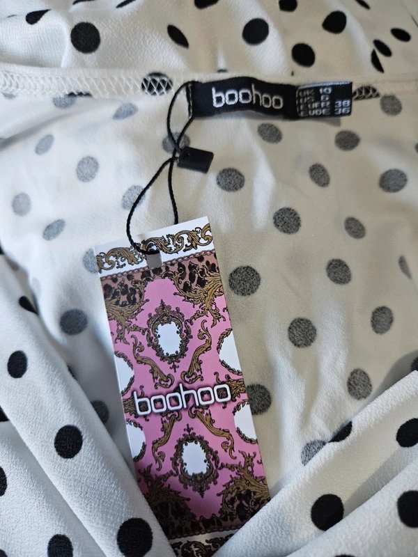 The Boohoo Black and White Polka Dot Playsuit is available in sizes S.