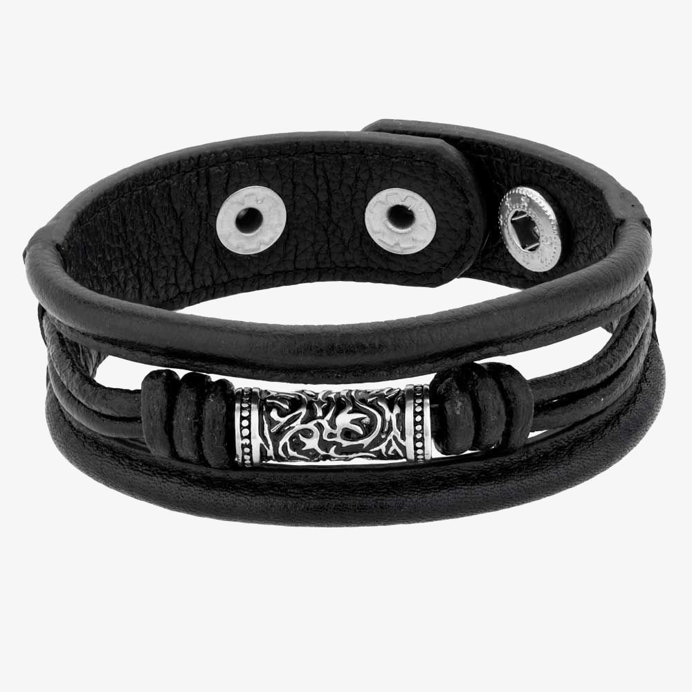 Stylish black leather bracelet from Bourne and Wilde, featuring a tribal-themed stainless steel centrepiece with oxidised detailing. The bracelet includes three rows and two knots for a secure fit.