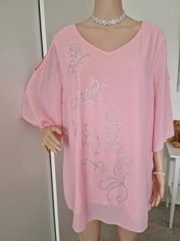 Pink Cold Shoulder Blouse with Flutter Sleeves — the perfect occasion top for special events. Designed in vibrant pink, this cold-shoulder blouse features flutter sleeves and silver sparkling sequins for a glamorous touch. Crafted from high-quality fabric with a fully lined and slimming design, it beautifully skims the hips and bottom. Ideal for cruises and other elegant occasions.