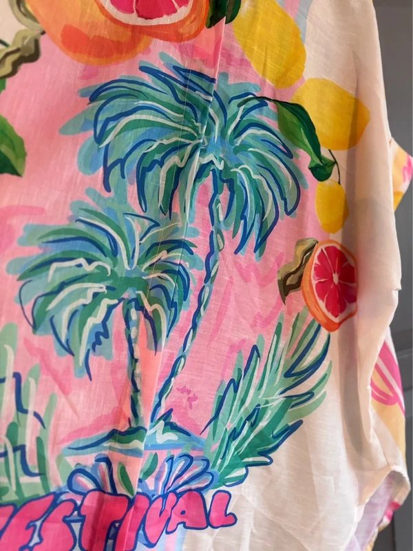 This oversized palm print shirt is perfect for summer. Made from a lightweight blend of linen 20% polyester 80%, it features a short sleeve design that is ideal for warm weather. Pair it with jeans or shorts for a casual look.