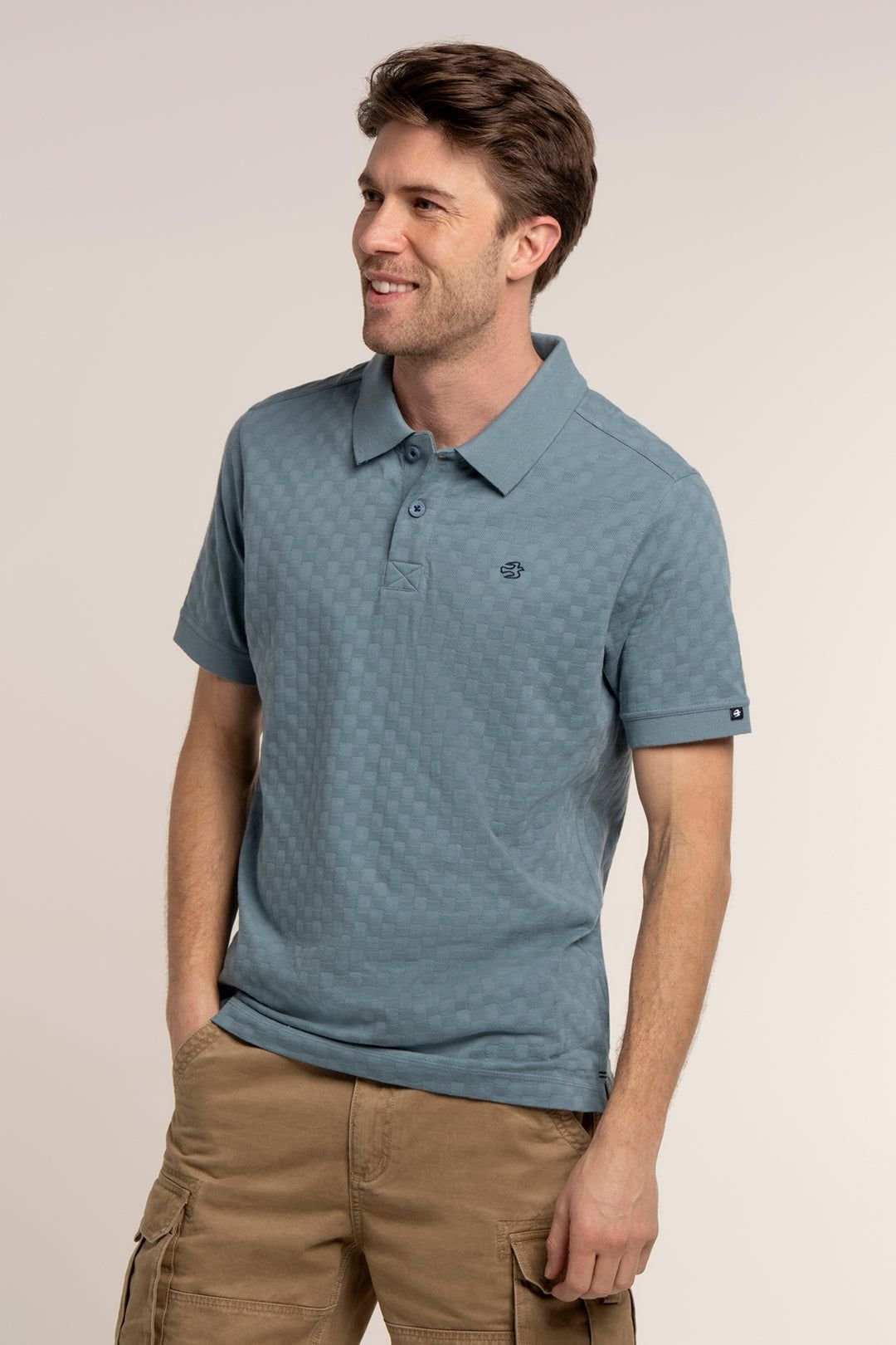 Stylish blue jacquard polo shirt by Brakeburn. Made from 100% cotton, it features a geometric textured pattern, a rib collar, and contrast tipping stripes on the cuffs. The back neck has stacked jacquard tapes and a branded embroidery on the under collar. Ideal for casual wear.