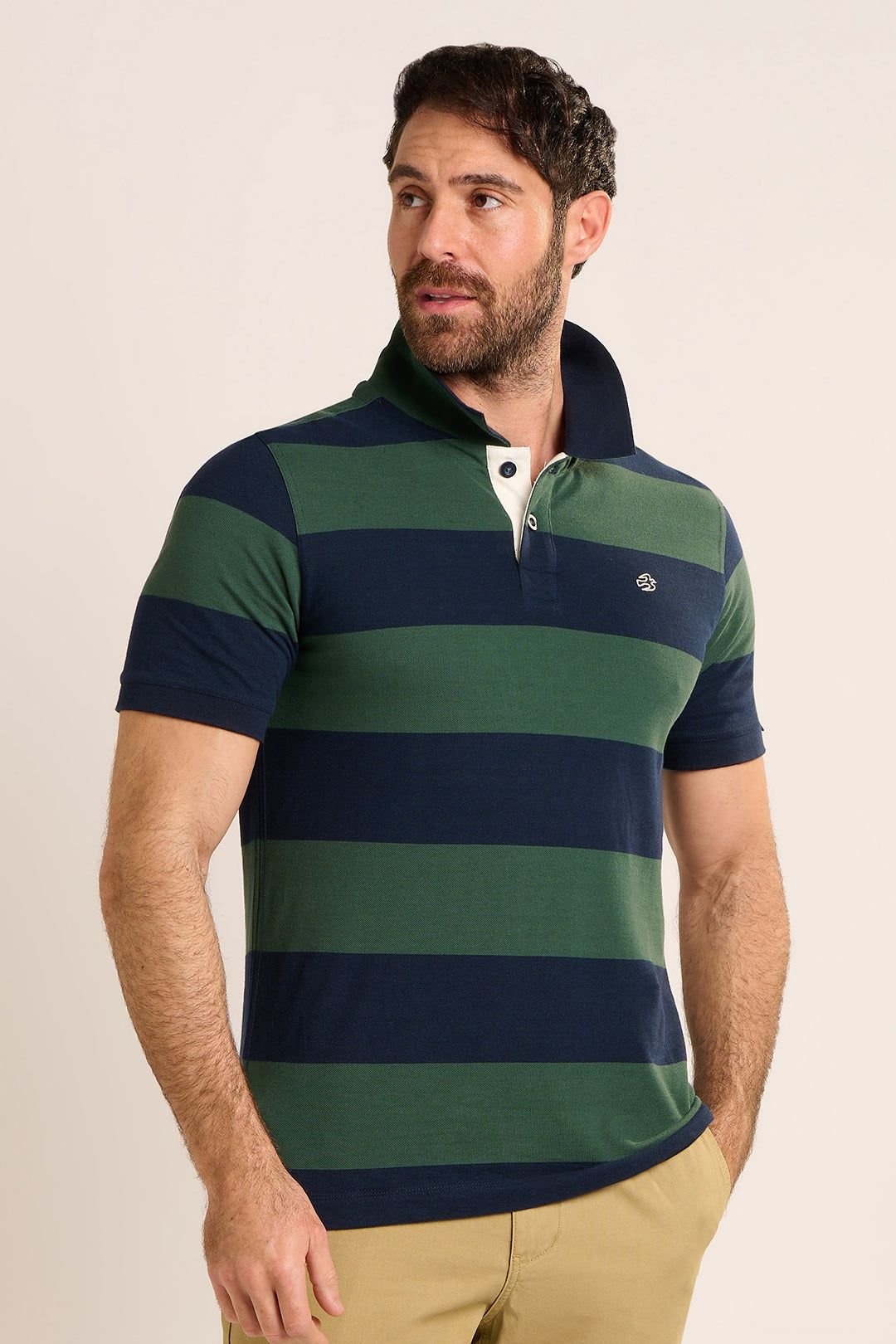Stylish green and navy striped polo shirt made from 100% cotton. Features a ribbed collar and cuffs with contrast tipping stripes, branded buttons, and stacked jacquard tapes at the back neck.