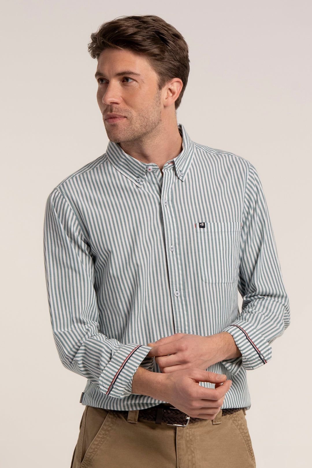 Stylish green striped shirt with a casual vibe. Features vertical stripes and a front chest pocket. Perfect for both casual and dressy looks.