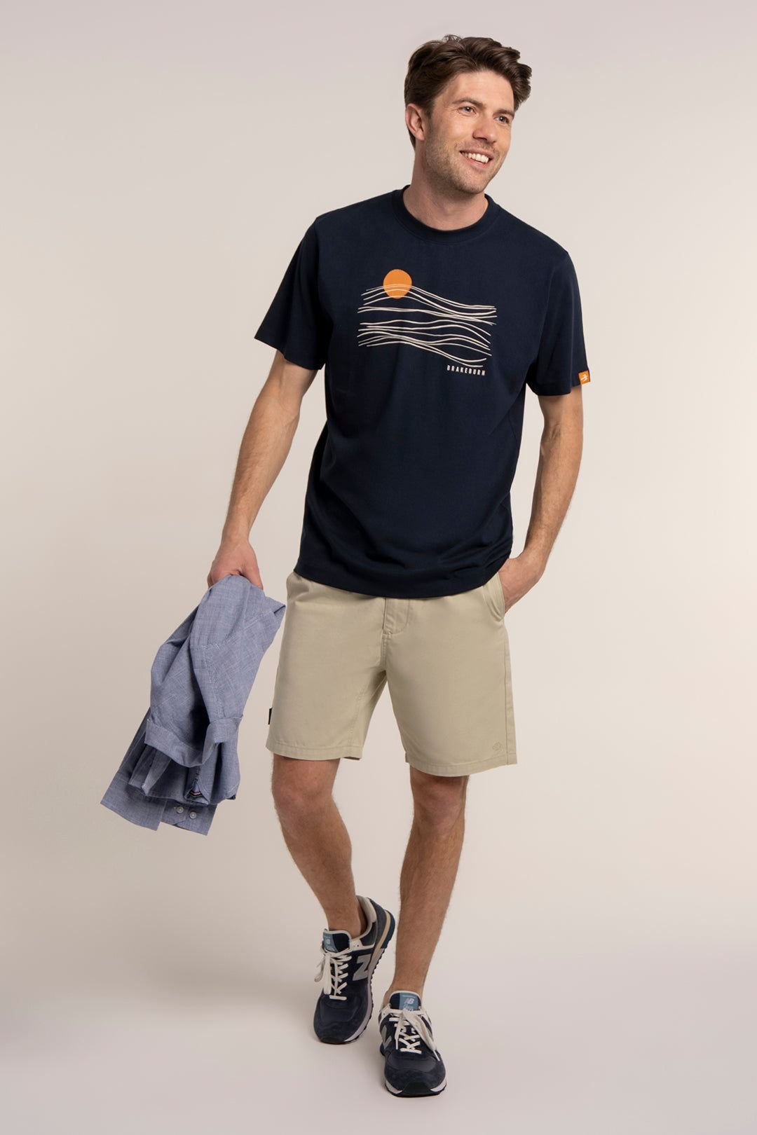 Stylish Navy cotton t-shirt by Brakeburn featuring a bold abstract sun and waves print. Designed for all-season wear, it includes a rib neck, twin needle shoulder stitching, and a branded bird tab at the sleeve.