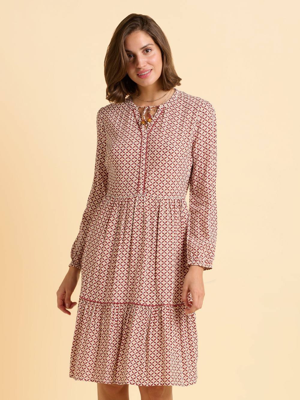 This red geometric print midi dress by Brakeburn features a lightweight fabric with elasticated cuffs, a gathered waist, and soft broderie details for a floaty fit. The notch neckline and tassel ties add a touch of elegance.