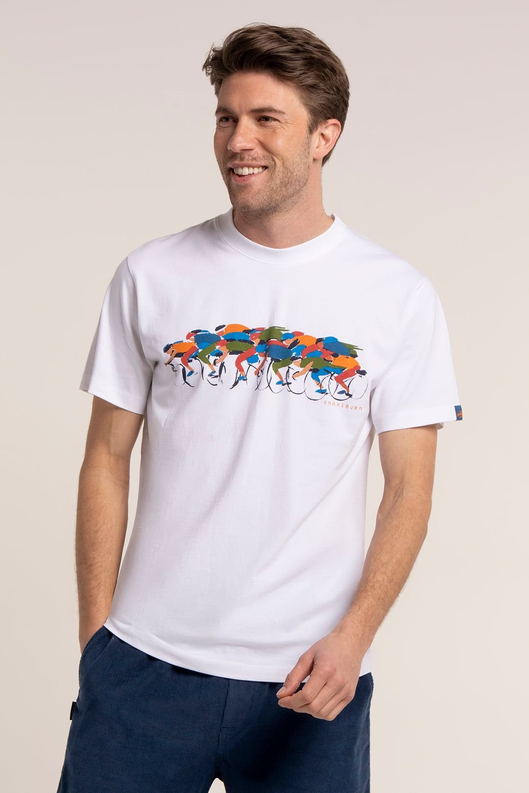 Stylish white cotton T-shirt with a vibrant peloton graphic and a branded bird logo on the back shoulder. Perfect for casual wear.