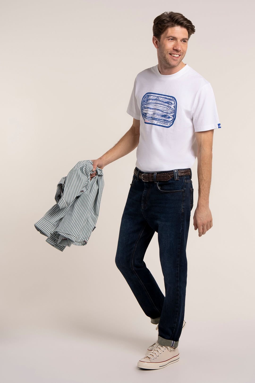 Casual white t-shirt by Brakeburn featuring a hand-drawn sardine graphic. Made from 100% cotton, it offers a comfortable and relaxed fit. Ideal for everyday wear.
