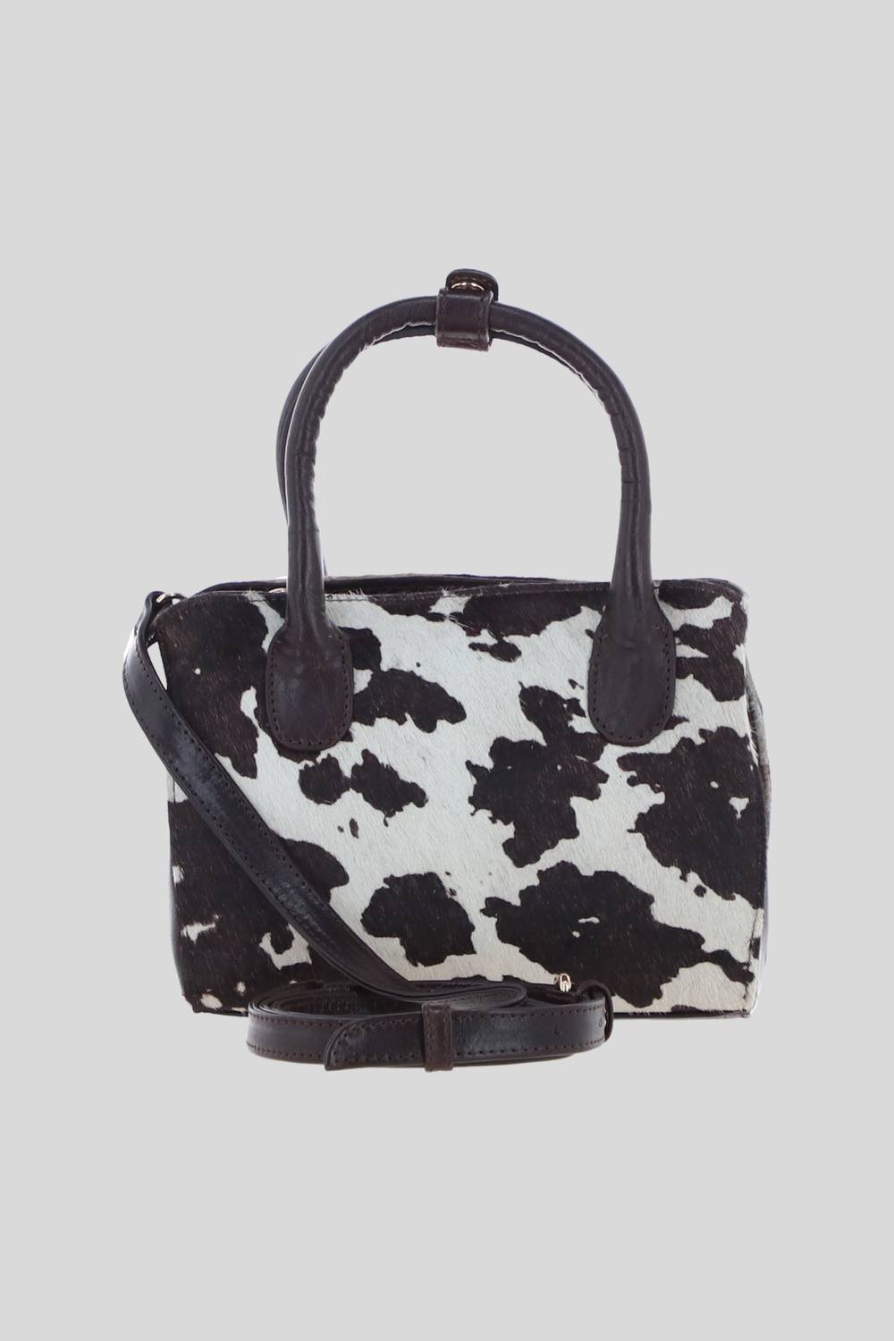 Striking Brampton London mini crossbody handbag in brown with distinctive hair-on leather detailing. Crafted from smooth leather with a structured silhouette and top zip closure. Perfect for everyday practicality and compact elegance.