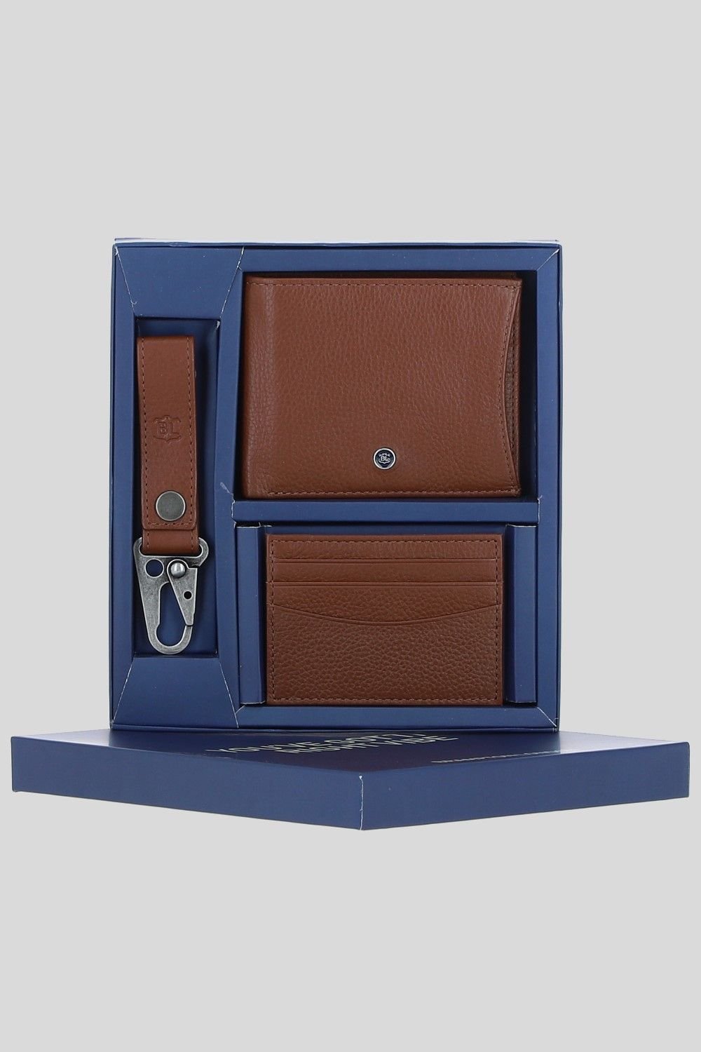 Stylish and practical leather gift set including a wallet, card holder, and key ring. Crafted from 100% genuine leather, this set is ideal for everyday use or as a thoughtful gift.