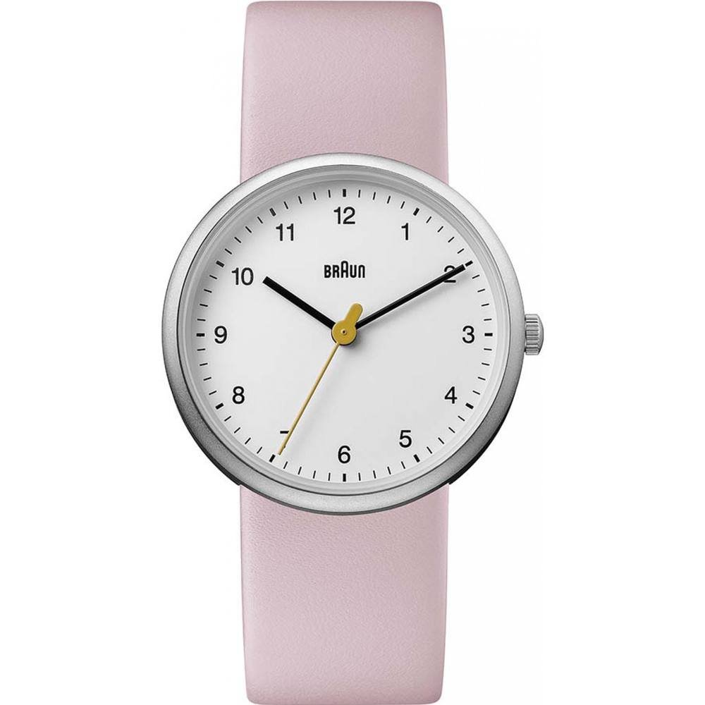 Stylish pink quartz watch from Braun, featuring a classic design with a metal case and leather strap. Ideal for everyday wear and special occasions.