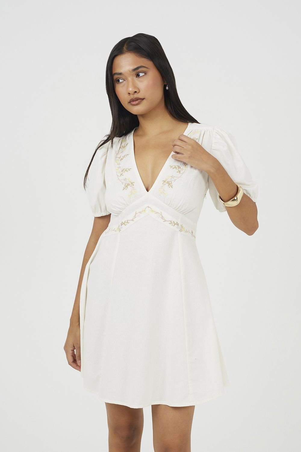 Charming cream cotton mini dress from Brave Soul. Featuring a flattering V-neckline and short puff sleeves with elasticated cuffs. Adorned with intricate floral embroidery across the neckline and body. Perfect for a delicate, comfortable fit.