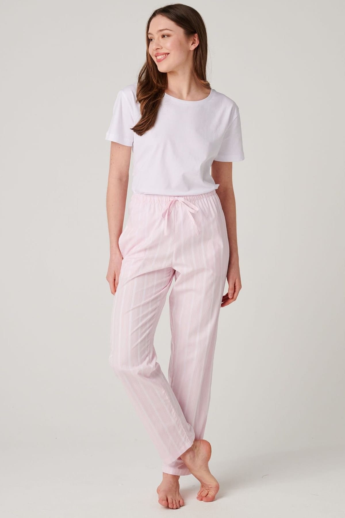 Experience ultimate comfort in these baby pink satin stripe pyjama trousers. Crafted from crisp cotton, they offer a lightweight and breathable feel, perfect for a restful night's sleep. The stripe design adds a touch of elegance to your sleepwear.