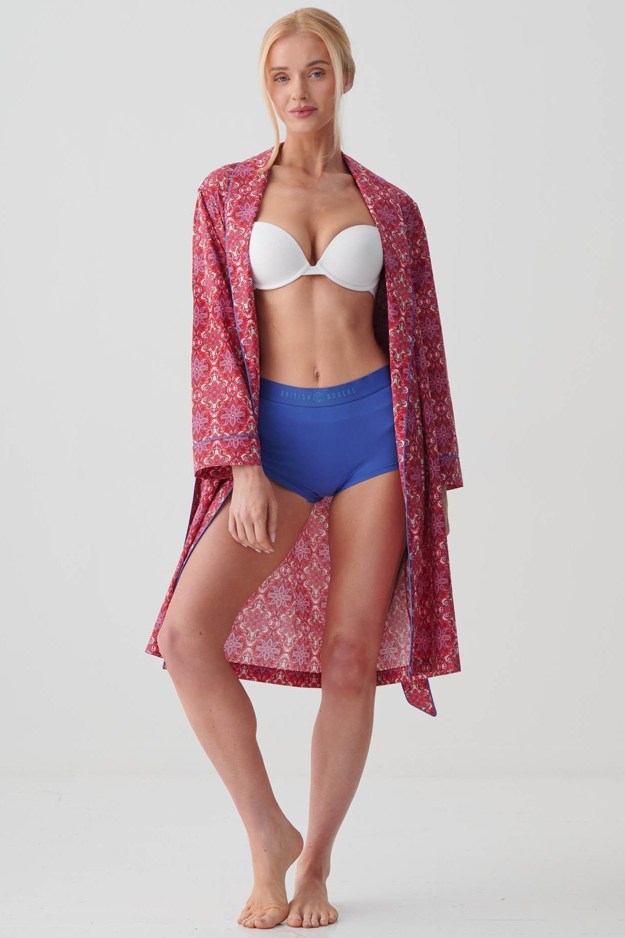 Elegant and lightweight, this dark pink cotton dressing gown features a Byzantine Paisley print. Ideal for home or holiday wear, it offers a mid-length wrap with a soft touch.