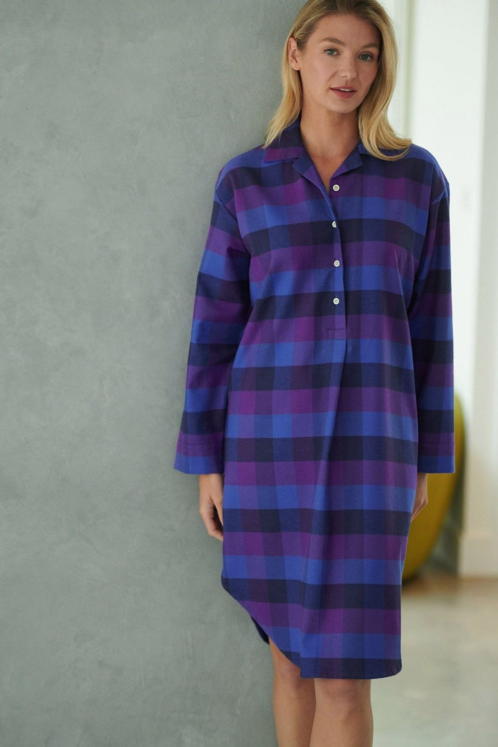 Chic and comfortable, this indigo check brushed cotton nightshirt is perfect for both lounging and wearing out. Featuring a classic check pattern and soft brushed fabric, it offers year-round comfort and style.