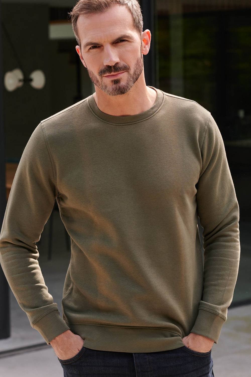 Relaxed and comfortable, this khaki sweatshirt is made from the softest jersey fabric. Features ribbed cuffs and hems for a snug fit. Ideal for casual wear.