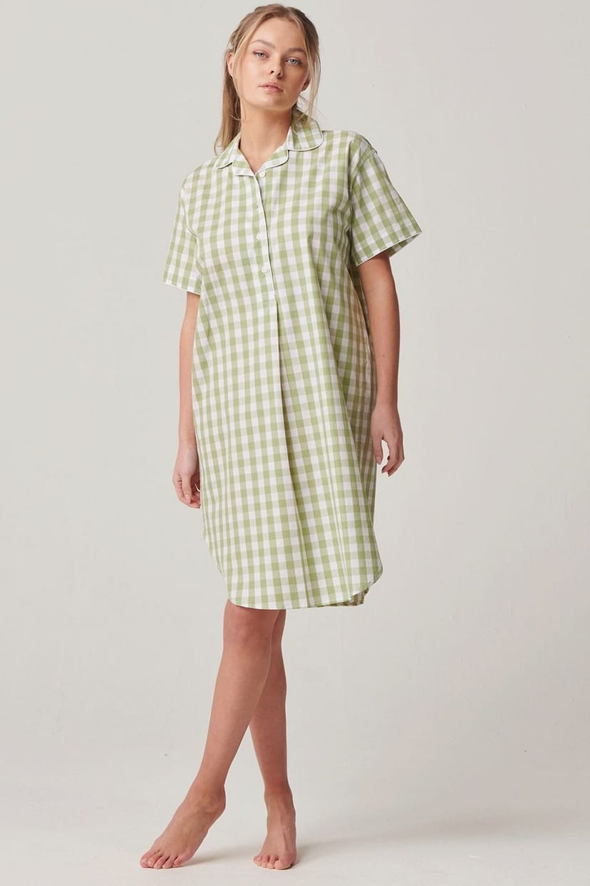 Chic and comfortable, this light green gingham cotton nightshirt is designed for both sleep and casual wear. Featuring a button-front closure and piping around the collar, it's perfect for relaxed days or evenings in.