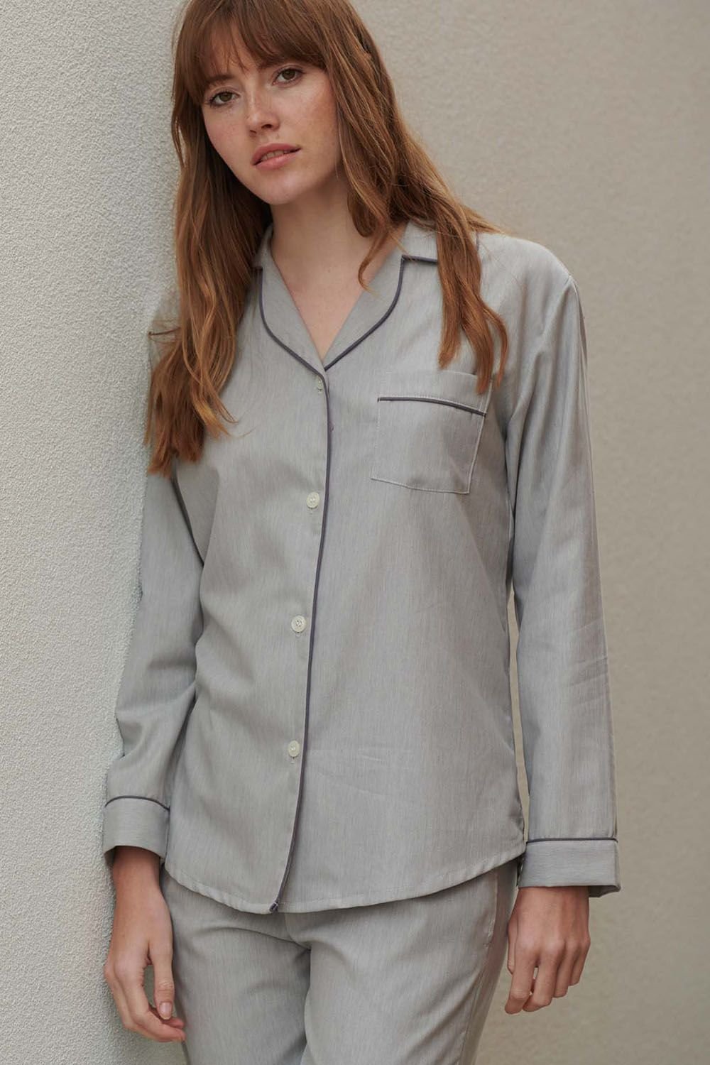 Elegant light grey cotton twill pyjama set featuring a herringbone pattern. The set includes a long-sleeve shirt with a chest pocket and a pair of straight-leg pants. Ideal for a restful night's sleep.