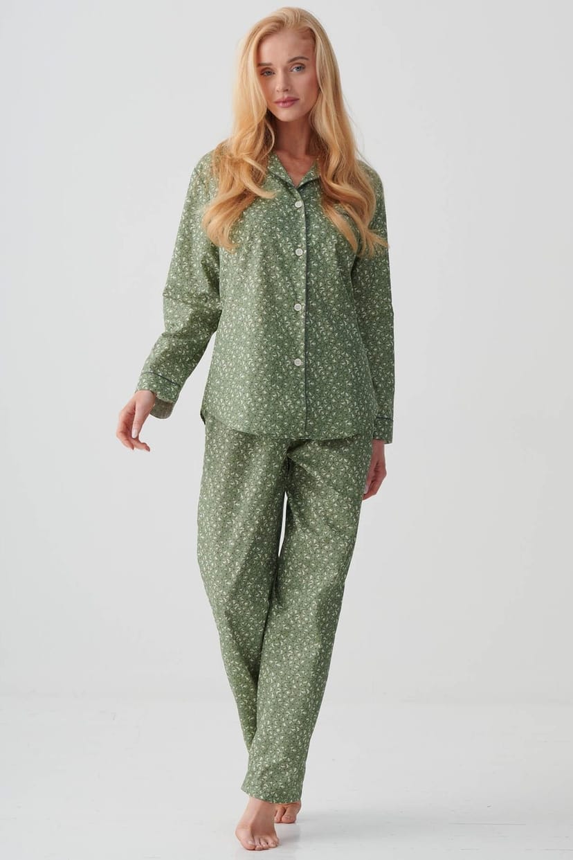 Charming pale green floral pyjama set by British Boxers. Featuring a rounded-collar jacket with a curved hem and a breast pocket, paired with tie-waist pants. Ideal for a restful night's sleep.