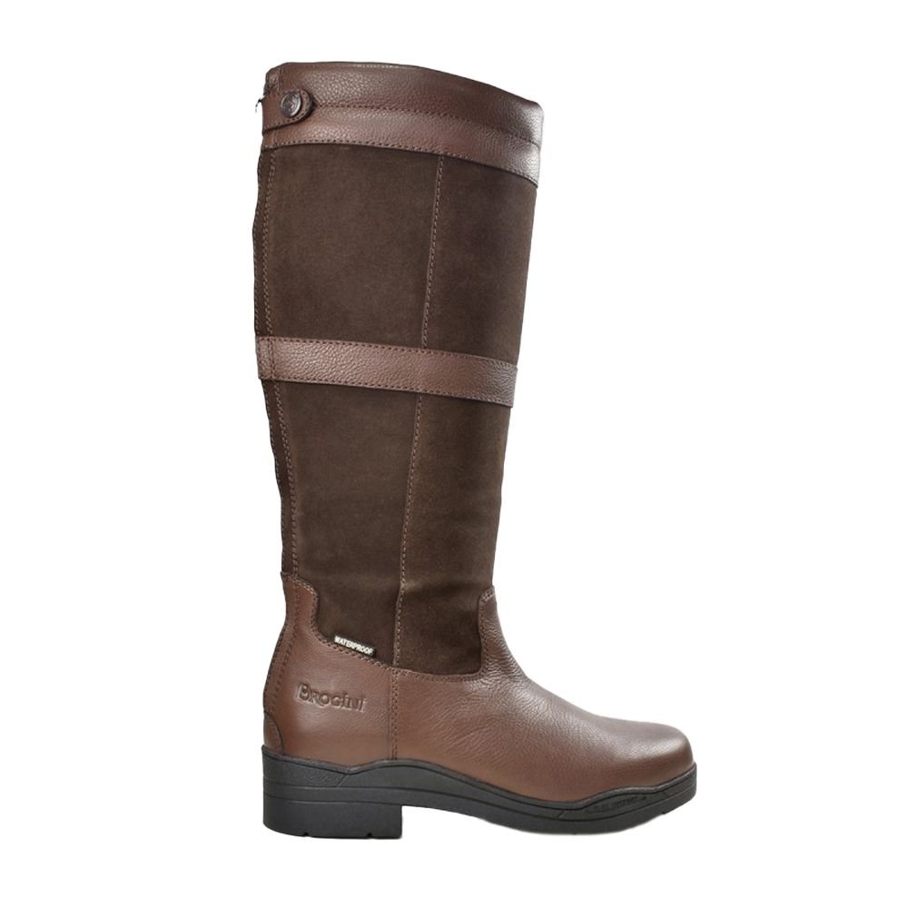 Stylish calf-length country boots in brown leather with a plain design. Features a waterproof upper, moisture-wicking lining, and a cushioned insole. Ideal for outdoor activities.